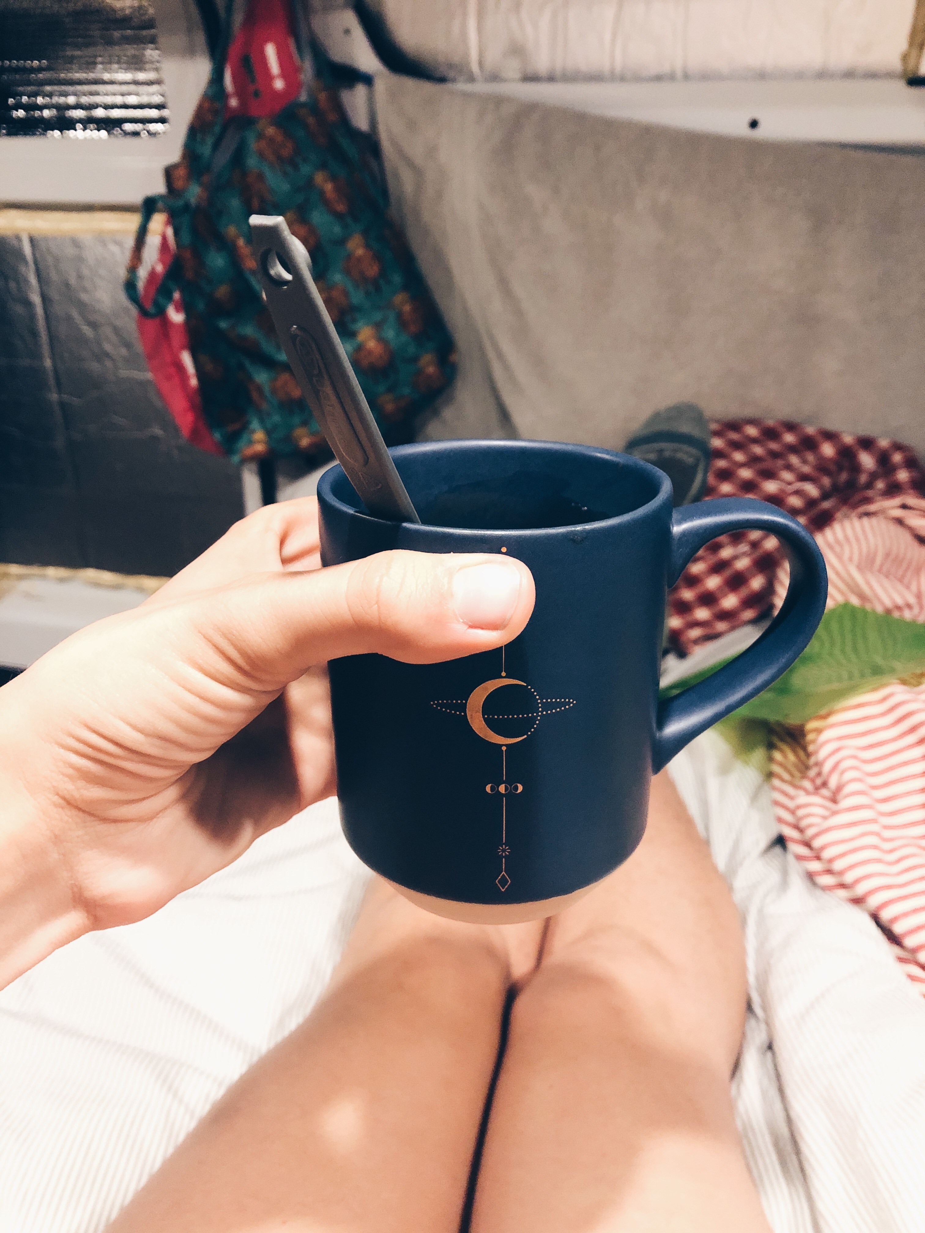We had coffee In the van because of the wind and rain but that did not stop Annabelle from getting cozy.